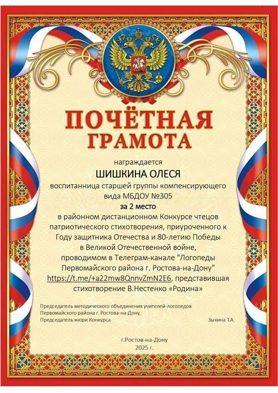 Воспитанница Шишкина Олеся приняла участие в районном конкурсе патриотической стихотворения. Она прочитала стихотворение «Родина» автора В. Нестеренко.
